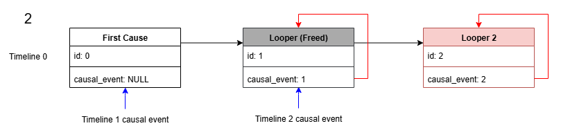 The newly allocated event is added to the event list [1] before its causal event is fetched [2]. This allows an event to be created with its own ID as the cause_event_id